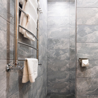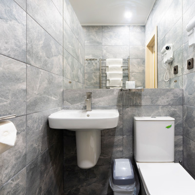Ванная комната европейского стандарта с туалетными принадлежностями, тапочки, фен, косметический набор.